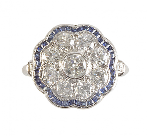 Sortija flor estilo Art-Decó con rosetón de brillantes y marco lobulado de zafiros calibrados