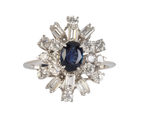 Sortija con zafiro oval central rodeado por brillantes y diamantes talla baguette engastados a diferentes alturas