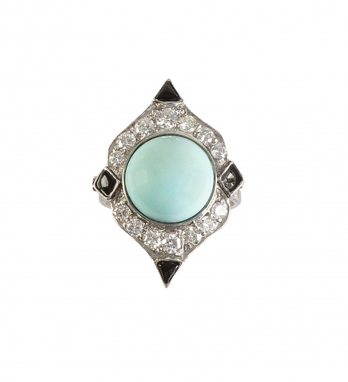 322. Sortija lanzadera estilo Art-Decó con cabuchón central de turquesa rodeado por marco geométrico de brillantes con ónix en puntos cardinales