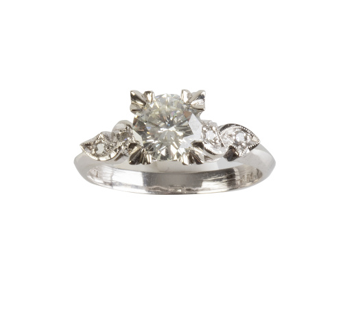 Sortija solitario con brillante engastado en cuatro garras que forman marco cuadrangular, con hojitas de brillantes adornando los brazos de la montura