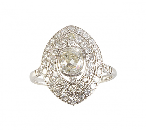 Sortija ojival con brillante central oval de talla antigua 1,10 ct aprox rodeado por dos orlas de brillantes