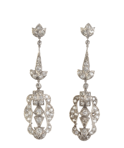 328. Pendientes largos de pp. S. XX cuajados de brillantes, con pieza inferior lobulada y calada que pende de pieza en forma de punta de lanza