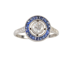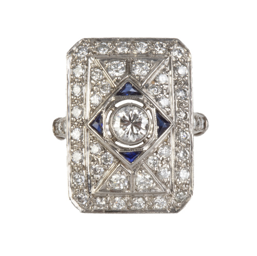 Sortija rectangular estilo Art-Decó con frente cuajado de brillantes, y chatón central enmarcado por cuatro zafiros talla triangular