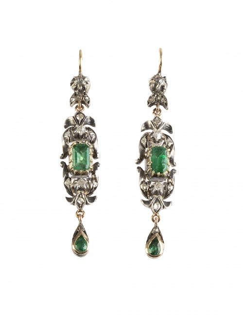 34. Pendientes largos S.XVIII-XIX con esmeraldas talla esmeralda central y colgante talla gota combinados con diamantes