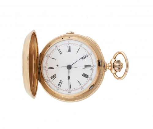 Reloj cronógrafo saboneta suizo en oro de 18K. Con sonería de repetición de cuartos. 27187
