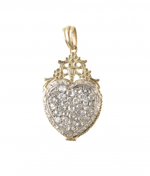 Colgante portafotos pp. S. XX con diseño de corazón, cuajado de brillantes de talla antigua, encabezado por flores caladas
