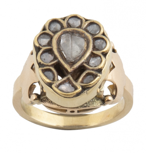 Sortija de origen Indú estilo mughal con diamantes que componen flor en forma de gota, y en su base motivos vegetales realizados en esmalte rojo y verde