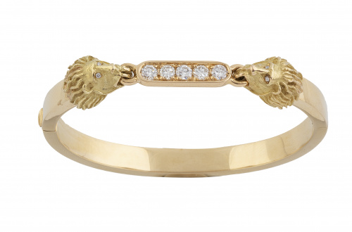 Brazalete con frente de dos cabezas de león sosteniendo barra con 5 brillantes