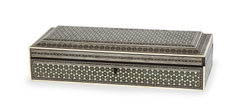 Caja rectangular con marquetería de micromosaico (sadely) en hueso y metal y madera teñida.