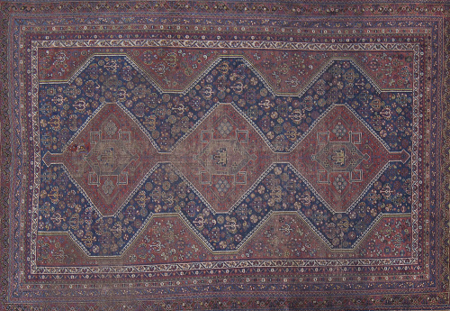 Alfombra en lana con campo azul y cartuchos geométricos en granate.