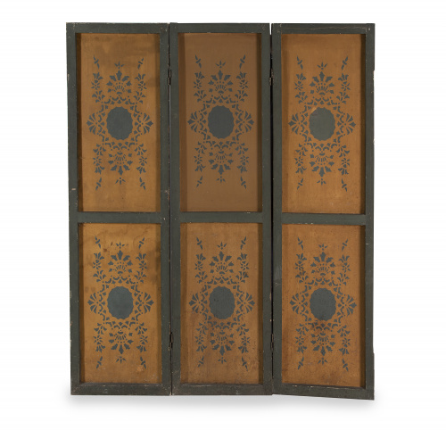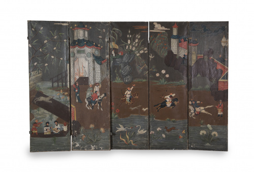 489. Biombo de cinco hojas con escena cinegética pintada al óleo.