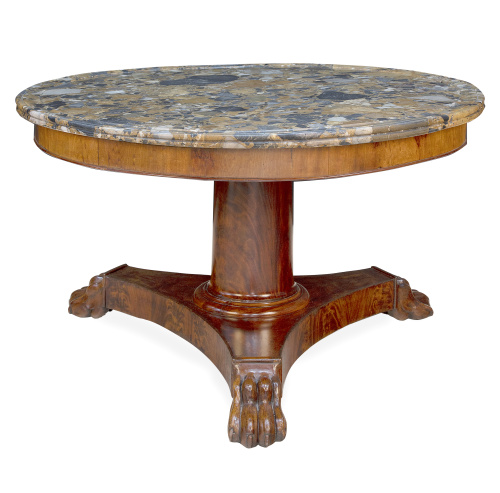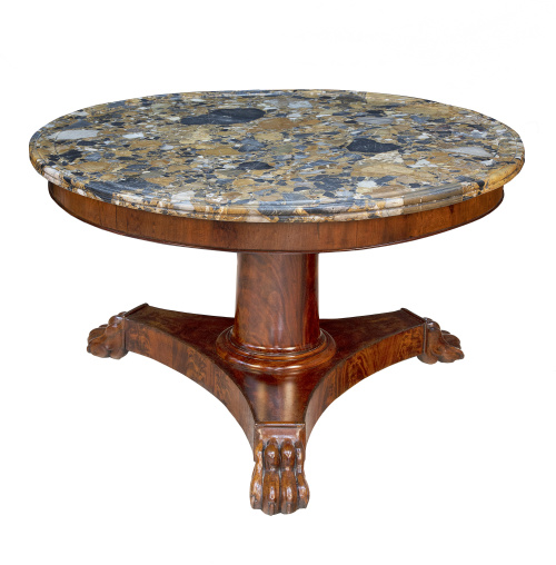 Gueridón Carlos X de madera de caoba y palma de caoba, tapa de mármol veteada.