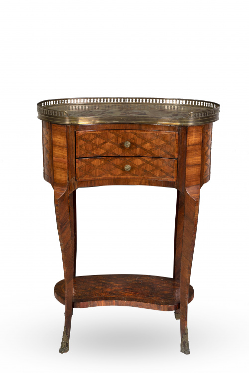 496. "Table á ecrire" Luis XVI en palo de rosa, palo de violeta y tapa de mármol y corredor de remate de bronce.