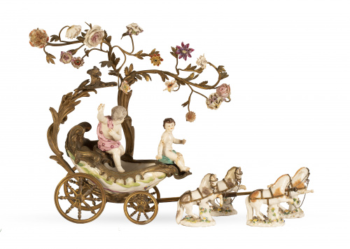 Carroza con putti en porcelana y metal.