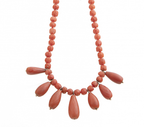 52. Collar de coral S. XIX con cuentas facetadas y siete perillas facetadas colgantes de tamaño creciente hacia el centro