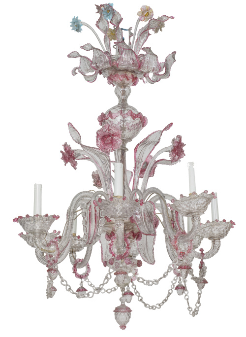 Lámpara de techo de ocho brazos de luz en cristal incoloro y rosa y azul.