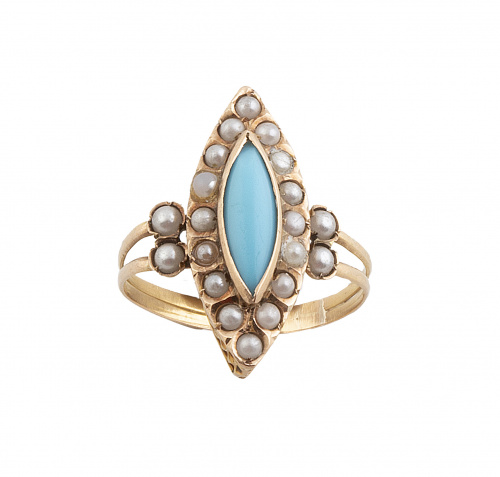 Sortija navette S. XIX de turquesa y perlas de vidrio