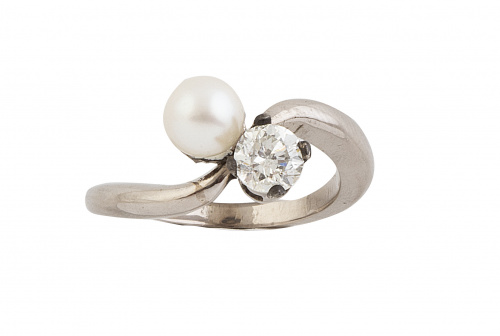Home / SUBASTA OCTUBRE 2022 / Sortija tu y yo de perla y brillante en montura sinuosa
