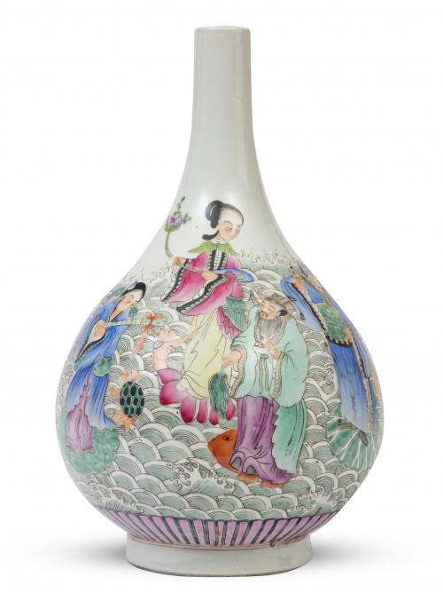 1018. Jarrón de porcelana esmaltada de familia rosa decorado con los "ocho inmortales".