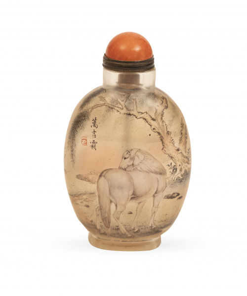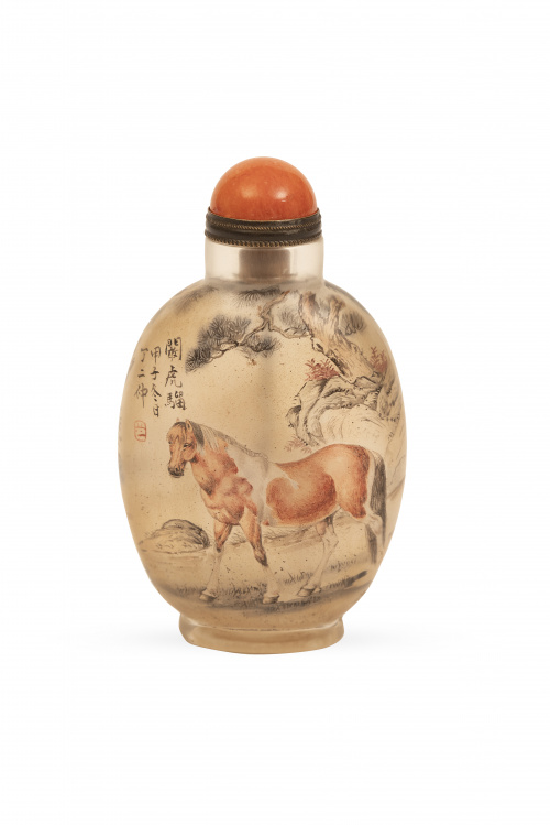 1028. "Snuff-bottle" o tabaquera, pintada bajo cristal. Firmado.