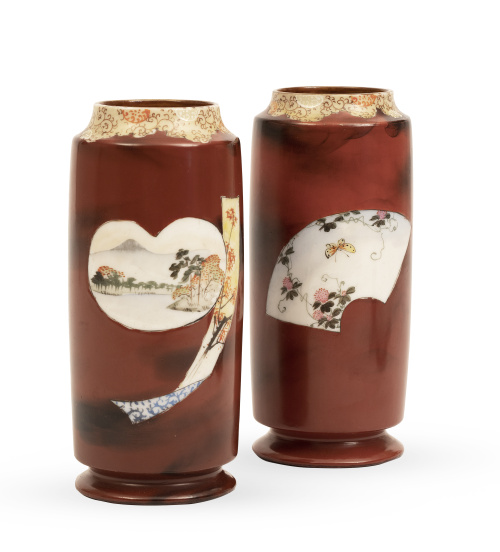 1136. Pareja de floreros de porcelana, con reservas decorativas con paisaje, mariposas y flores.