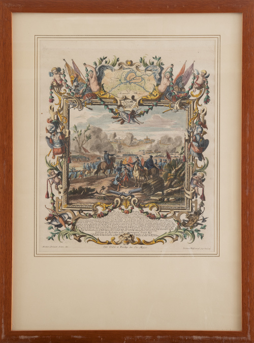 Se trata de una de las 52 vistas que representan las principales batallas navales y terrestres de la Guerra de Sucesión Española (1701- 1714) grabadas según dibujos y cuadros de Paul Decker y publicadas por Ieremías Wolff en “Repræsentatio belli, ob successionem in regno Hispanico auspiciis trium potentiss” hacía 1720.