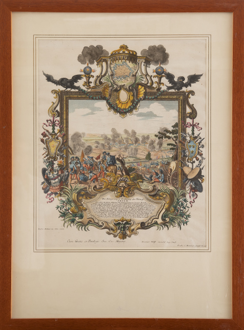 Se trata de una de las 52 vistas que representan las principales batallas navales y terrestres de la Guerra de Sucesión Española (1701- 1714) grabadas según dibujos y cuadros de Paul Decker y publicadas por Ieremías Wolff en “Repræsentatio belli, ob successionem in regno Hispanico auspiciis trium potentiss” hacía 1720.