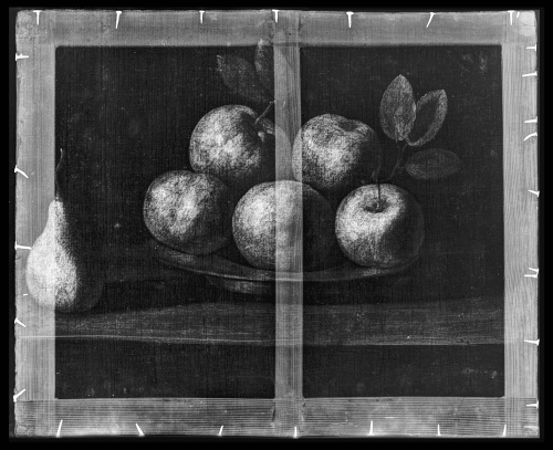 El estudio técnico por radiografía, nos confirma el magnífico estado de conservación de la obra, pintado sobre un lienzo que presenta sus dimensiones originales inalterables y nos muestra una composición que se establece con la seguridad y confianza del pintor. Se puede apreciar una leve variación en los contornos de la manzana del extremo derecho.