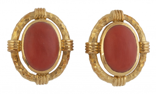 114. Pendientes portugueses años 30, con cabuchones de coral mediterráneo, con marco de banda arqueada con decoración martelé