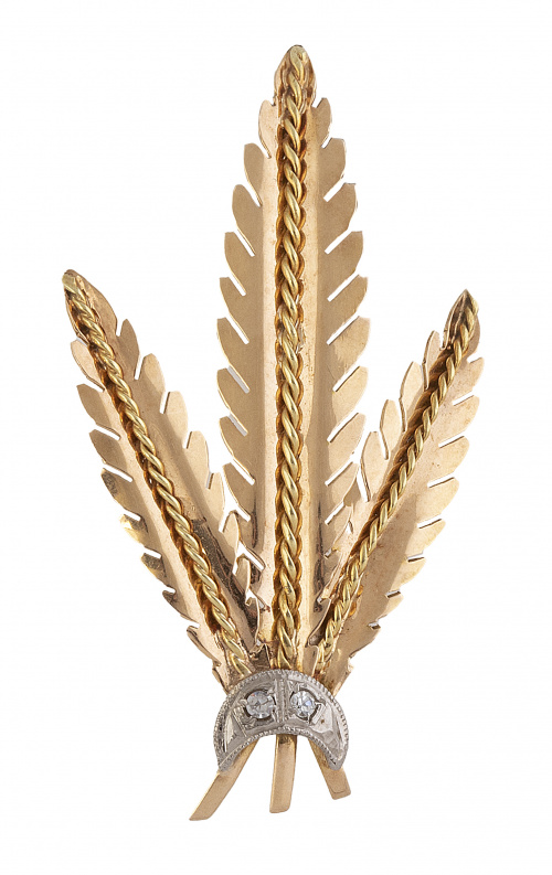 122. Broche años 50 con tres plumas, unidas en la base con aro de diamantes