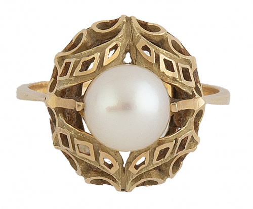 Sortija años 60 con perla cultivada en montura elevada con decoración calada