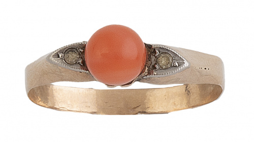13. Sortija de pp. S. XX con esfera de coral entre dos zafiros blancos