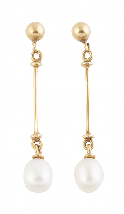 Pendientes largos con perlitas ovoides colgantes de barrita, y bolita de oro superior