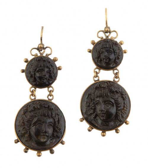 Pendientes largos italianos Grand Tour S. XIX con dobles camafeos de carey que representan bustos de dama tallados en alto relieve