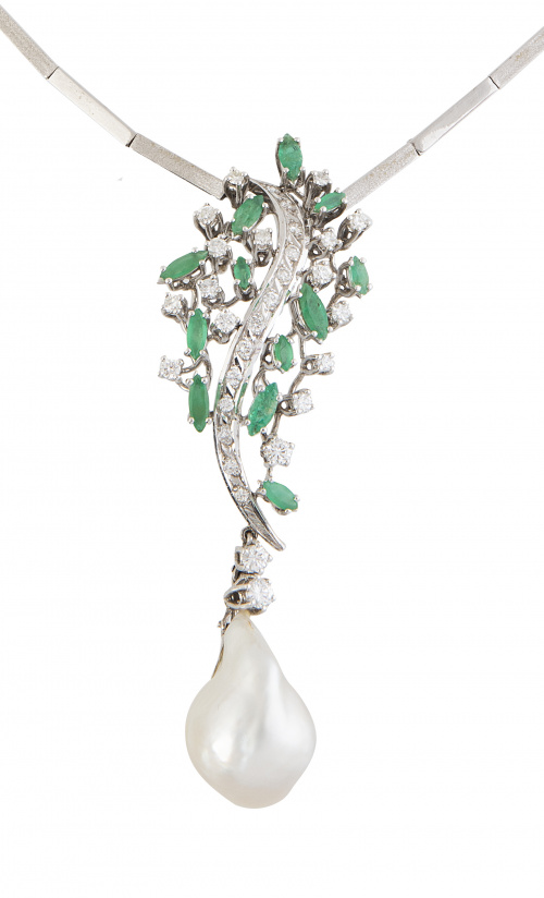 Collar con centro de brillantes y esmeraldas del que pende gran perla australiana barroca encabezada por dos brillantes