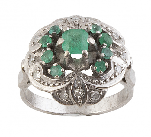 Sortija flor años 60 con esmeraldas y brillantes engastados a diferentes alturas en montura bombé calada