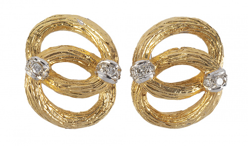 189. Conjunto de pendientes y sortija de aros con decoración grabada entrelazados adornados con brillantitos