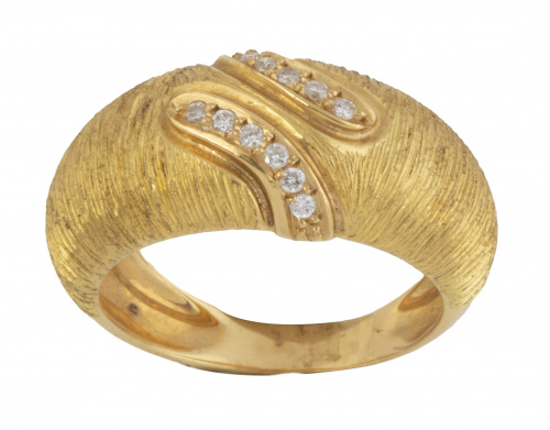 231. Sortija ancha con dos líneas sinuosas de brillantes en el centro, sobre frente ancho y curvo con decoración matizada