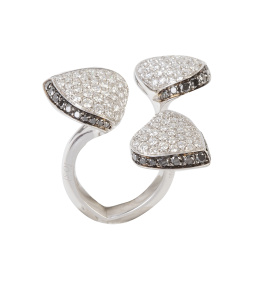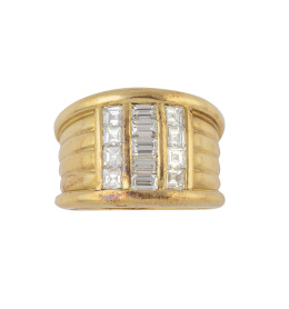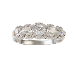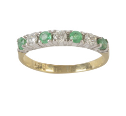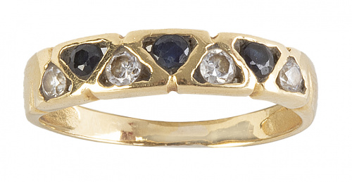 232. Sortija media alianza con tres zafiros y cuatro circonitas alternos en marcos triangulares