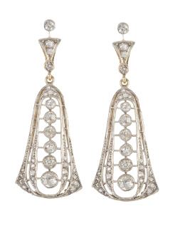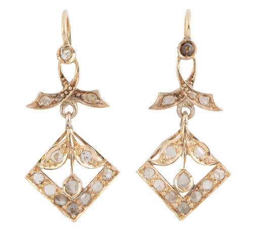 24. Pendientes largos de pp. S XX con diseño de rombo colgante de hojitas, decorados con diamantes