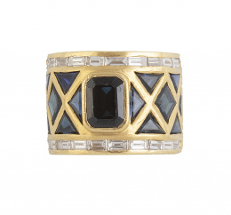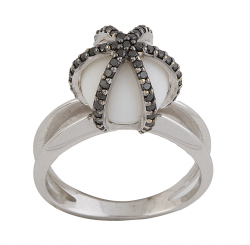 244. Sortija con esfera de ágata blanca en jaula esférica de brillantes negros