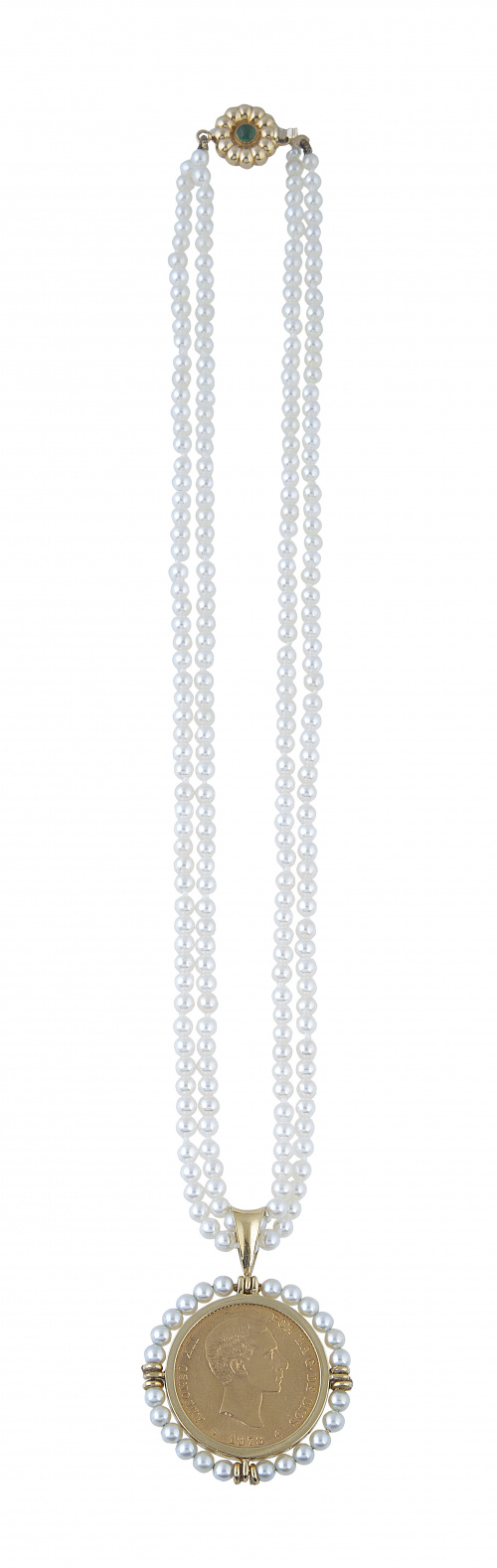 Collar de perlas con centro de moneda colgante de 25 ptas de Alfonso XII de oro, con cierre flor de oro y esmeralda