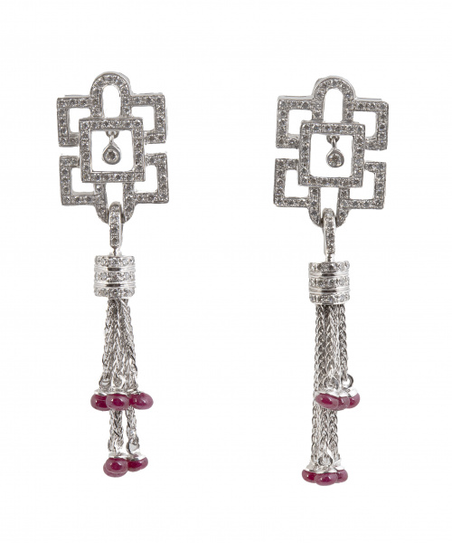 289. Pendientes largos de brillantes y rubíes con diseño de inspiración oriental