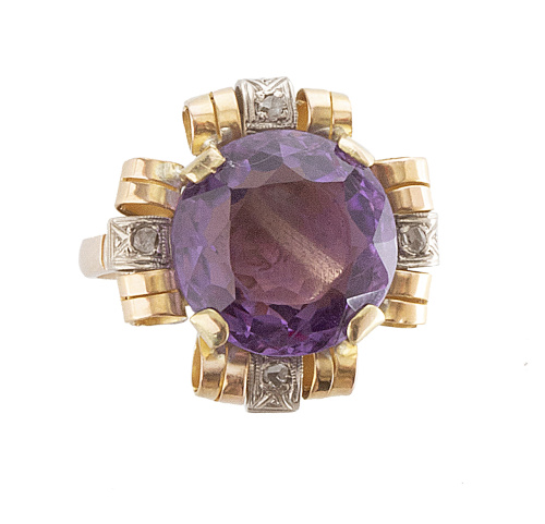 Sortija flor años 30 con amatista de talla redonda rodeada por roleos de oro rosa y platino adornados con brillantes