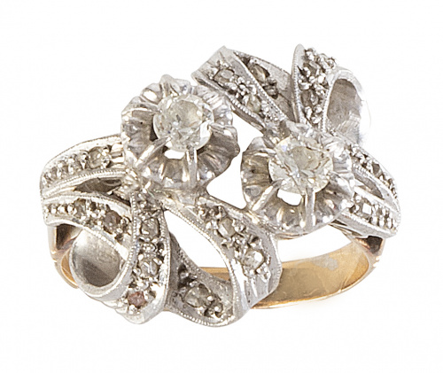 Sortija años 60, de brillantes con dos brillantes entre cintas entralazadas de diamantes