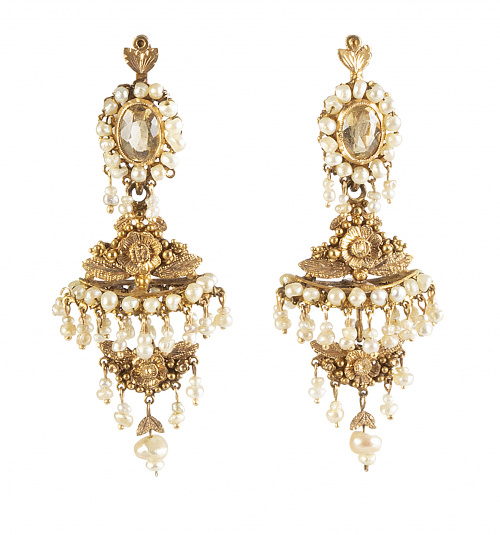 3. Pendientes valencianos de balconet S. XVIII-XIX con perlas finas de aljófar en varios cuerpos articulados, coronados por citrino orlado de perlas