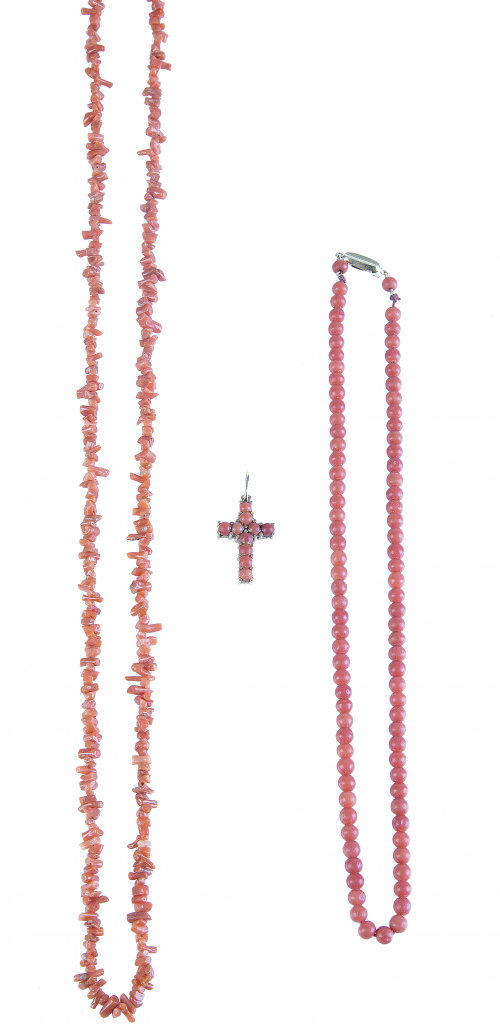 Lote de tres piezas de coral de pp. S. XX compuesto por dos collares y una cruz colgante