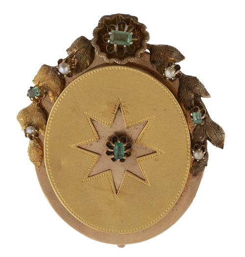 Broche colgante oval S. XIX con guirnalda superior y estrella central adornadas con esmerladas y perlitas fina