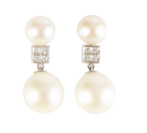 361. Pendientes largos con dos perlas y entre ellas cuadrados de brillantes