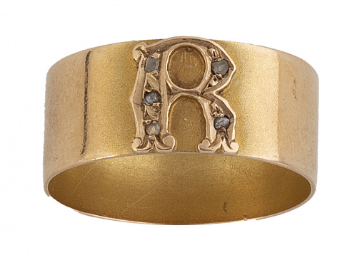 Sortija de pp. S. XX con "R" de diamantes sobre banda de oro liso